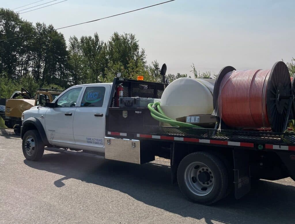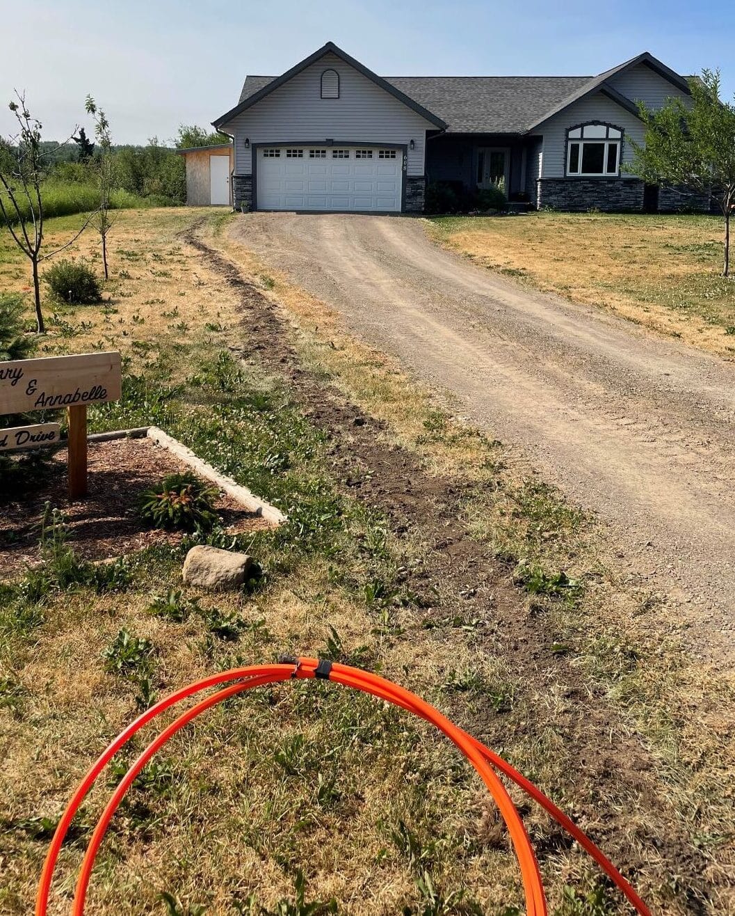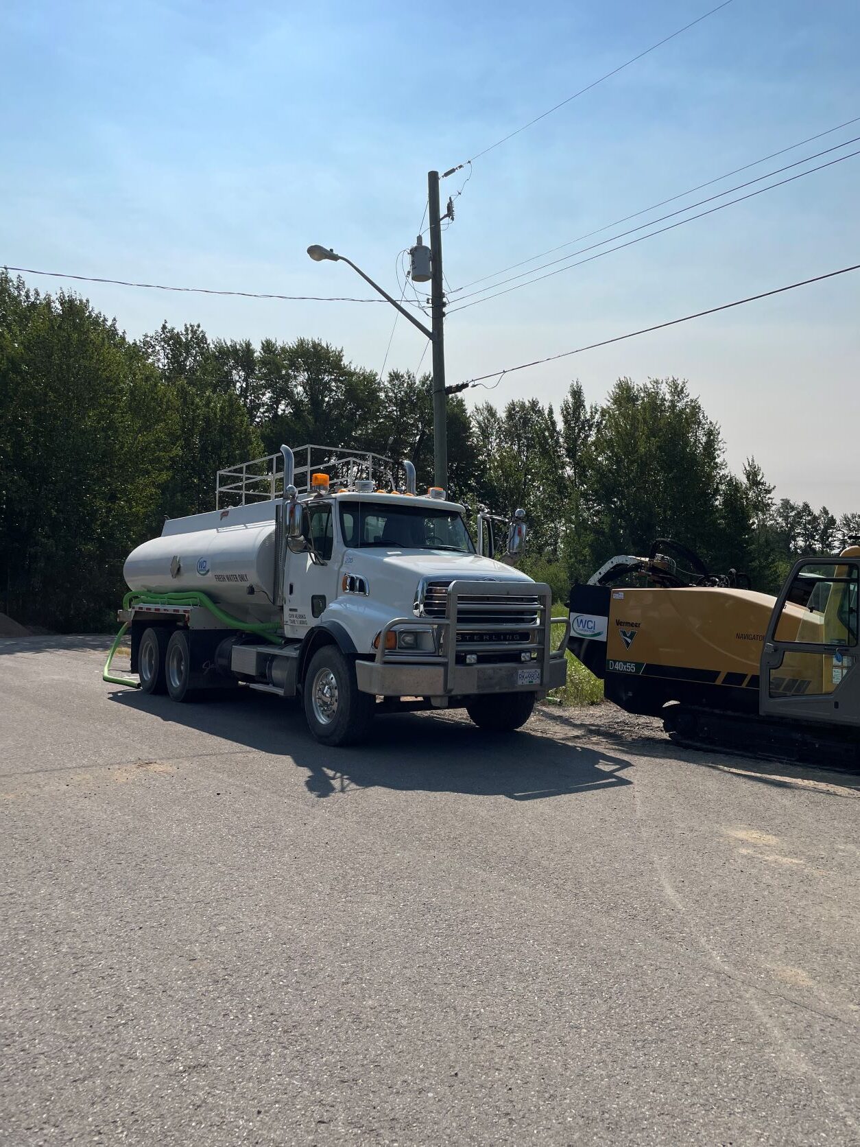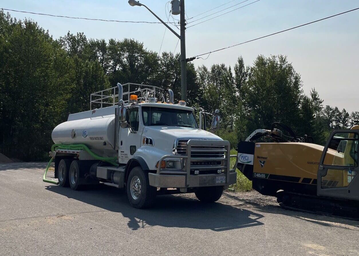 Here are some photos that represent what the home fibre connection process will look like in your community. 1. Backbone conduit is ready for underground installation. 2. Horizontal Directional Drill. Pure water is used to keep the drill hole open, so conduit can be pulled back through. 3. Water Supply for Horizontal Directional Drill 4. Hydro Vac captures all material flowing out of the Drill hole. 5. WCI Crew performing a Horizontal Drill. 6. Pilot hole for Vibratory Plow entry. 7. Vibratory Plow – Plows Fibre Optic in to 600mm depth, warning tape at 300mm. 8. Completed Drop, conduit in foreground. 9. Completed Home Drop