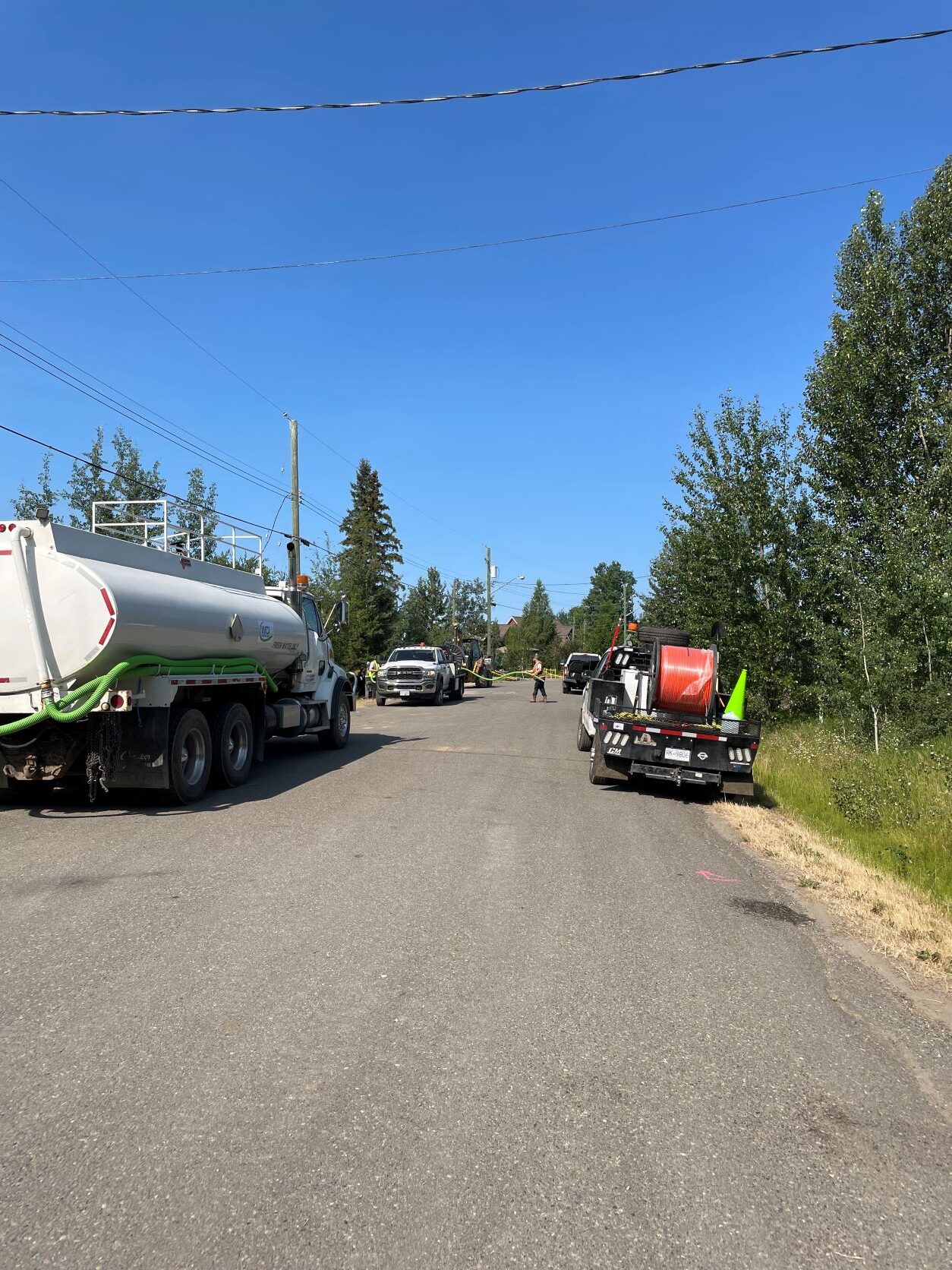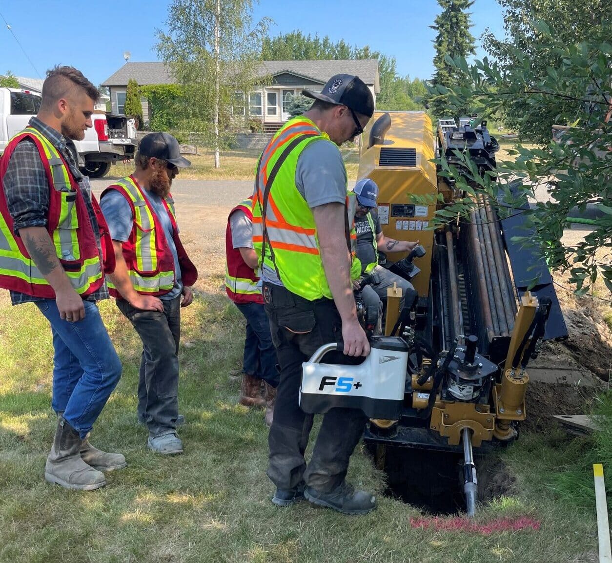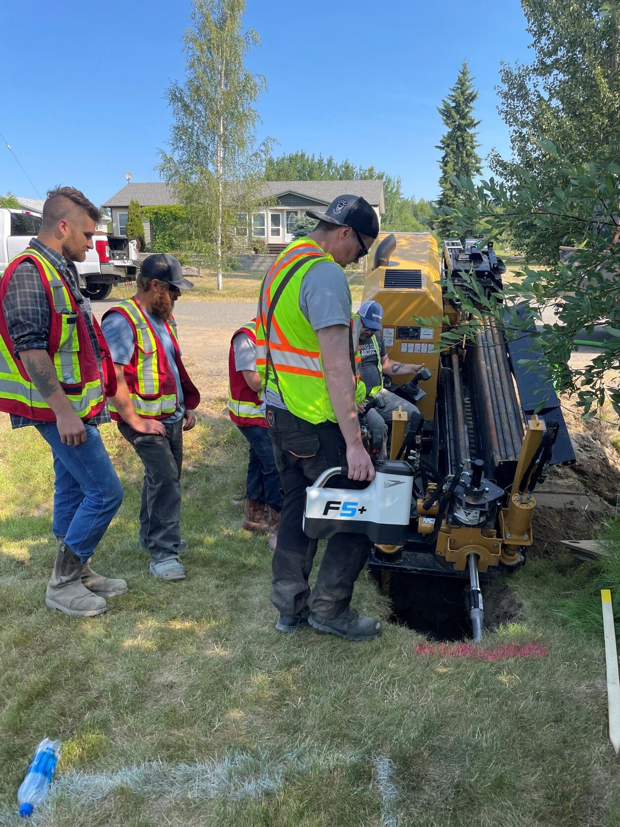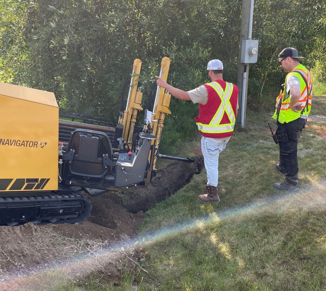 Here are some photos that represent what the home fibre connection process will look like in your community. 1. Backbone conduit is ready for underground installation. 2. Horizontal Directional Drill. Pure water is used to keep the drill hole open, so conduit can be pulled back through. 3. Water Supply for Horizontal Directional Drill 4. Hydro Vac captures all material flowing out of the Drill hole. 5. WCI Crew performing a Horizontal Drill. 6. Pilot hole for Vibratory Plow entry. 7. Vibratory Plow – Plows Fibre Optic in to 600mm depth, warning tape at 300mm. 8. Completed Drop, conduit in foreground. 9. Completed Home Drop